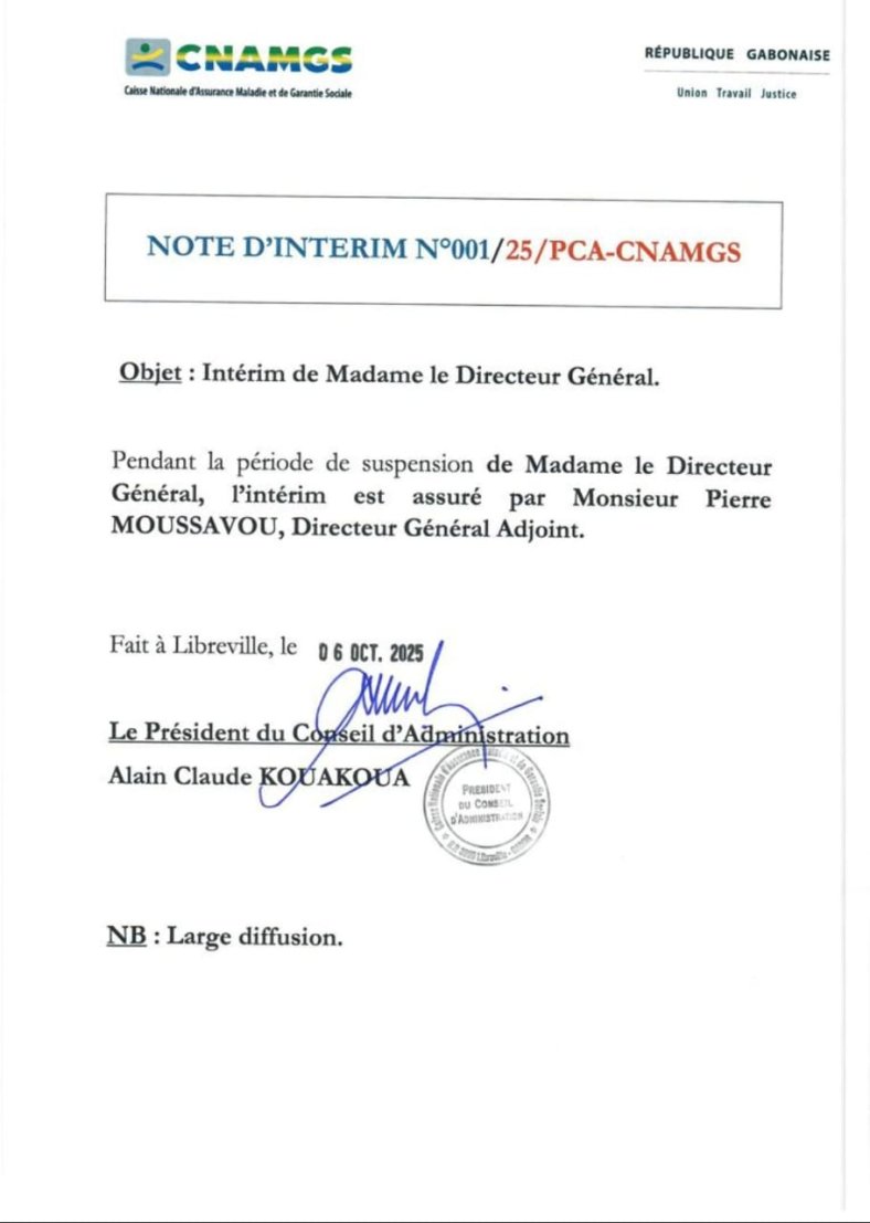 La décision a été rendue publique ce lundi 6 octobre 2025 à Libreville. Selon une note d’intérim n°001/25/PCA/CNAMGS, signée du Président du Conseil d’administration, Alain Claude Kouakou, M. Moussavou prend les commandes de l’institution jusqu’à nouvel ordre.