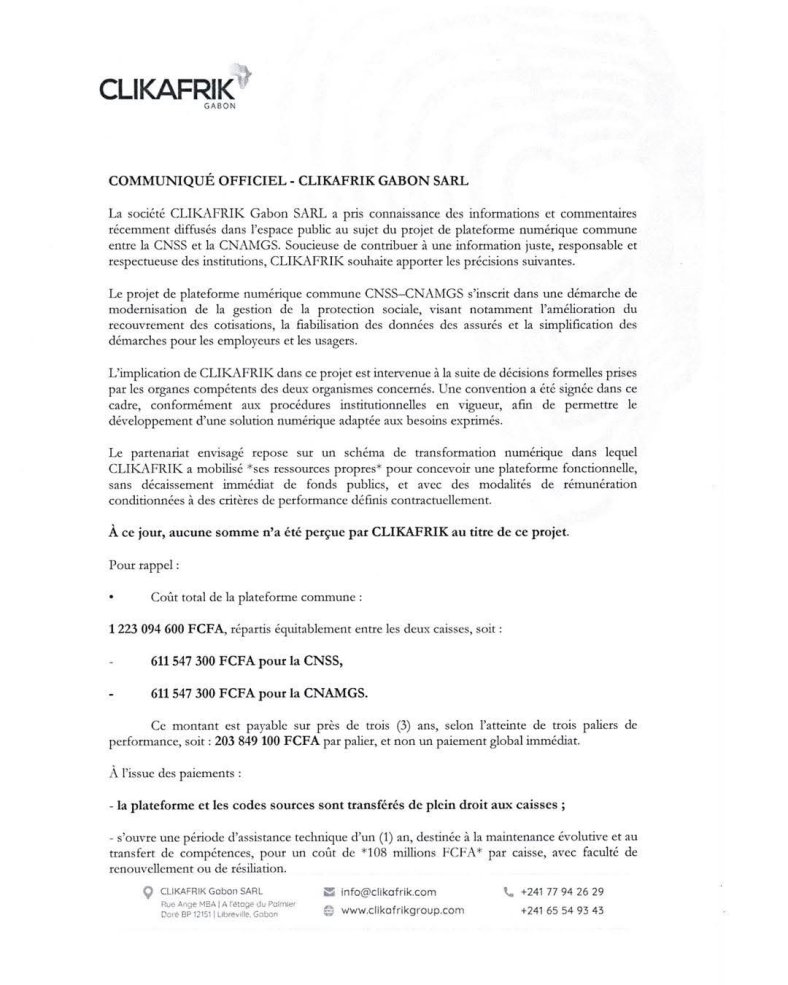 Depuis quelque jours, au cœur d’une polémique de corruption, la société ClickAfrik Group Limited, engagée dans un esprit de transparence et de responsabilité, a dans un communiqué rendu public, clarifier les termes du contrat lié à la plateforme numérique de la Caisse nationale de sécurité sociale (CNSS) et de la Caisse nationale d’assurance maladie et de garantie sociale (CNAMGS), deux organismes para-étatiques de sécurité et de protection sociale au Gabon.