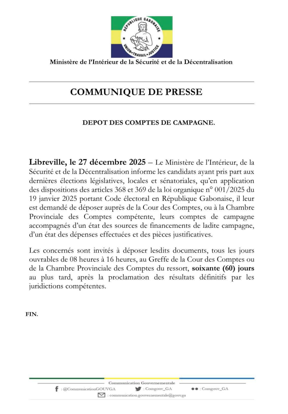 Ces comptes doivent être accompagnés d’un état détaillé des sources de financement, des dépenses effectuées ainsi que des pièces justificatives, conformément aux articles 368 et 369 de la loi organique n°001/2025 du 19 janvier 2025 portant Code électoral en République gabonaise.