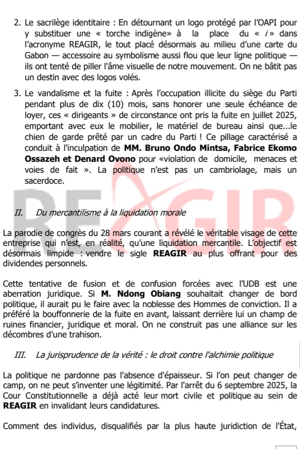 REAGIR dénonce également une tentative d’appropriation de son identité visuelle, avec la modification de son logo protégé, ainsi que des actes qualifiés de vandalisme. Le parti affirme que ses anciens membres auraient occupé illégalement son siège pendant plusieurs mois avant de quitter les lieux en emportant du matériel.