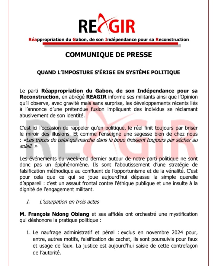 Le parti Réappropriation du Gabon, de son Indépendance pour sa Reconstruction (REAGIR) a vivement réagi, dans un communiqué publié hier, à l’annonce d’une prétendue fusion impliquant des individus se réclamant de son identité.
