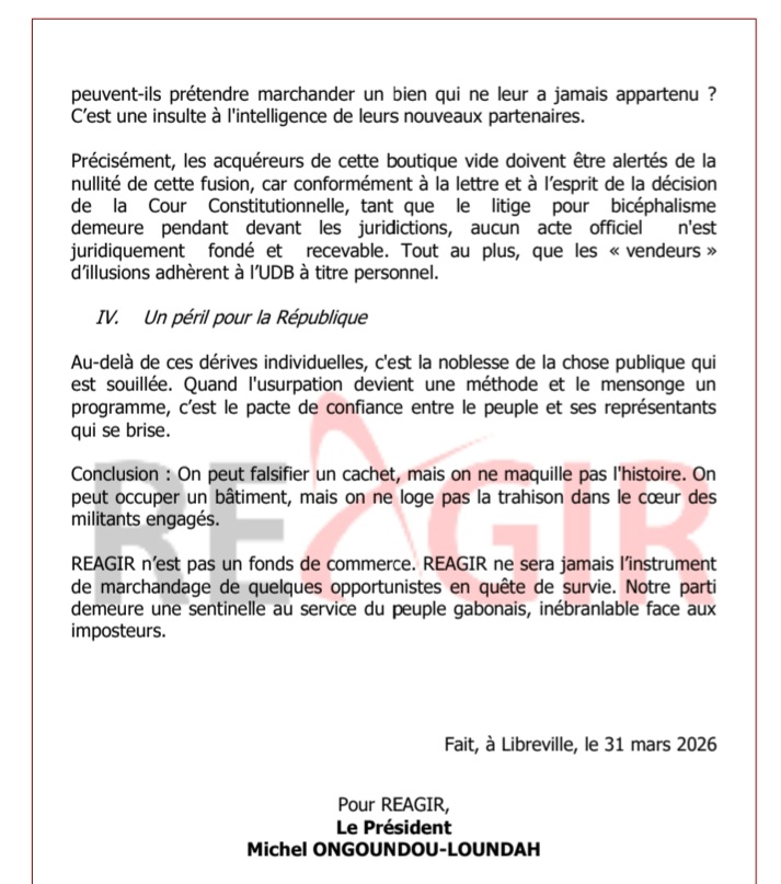 Dans ce document, la formation politique informe ses militants et l’opinion publique de la « gravité » de la situation, qu’elle qualifie de tentative d’usurpation. « En politique, le réel finit toujours par briser le miroir des illusions », a déclaré le président du parti, Michel Ongoundou Loundah, avant de rappeler, en guise d’avertissement : « On peut falsifier un cachet, mais on ne maquille pas l’histoire. »