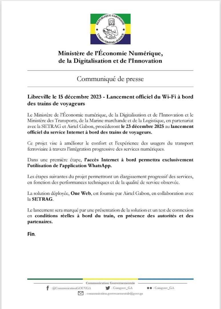 L’annonce a été faite ce lundi 15 décembre par le ministère de l’Économie numérique, de la Digitalisation et de l’Innovation, en collaboration avec le ministère des Transports, de la Marine marchande et de la Logistique, la Société d’exploitation du Transgabonais (SETRAG) et Airtel Gabon.