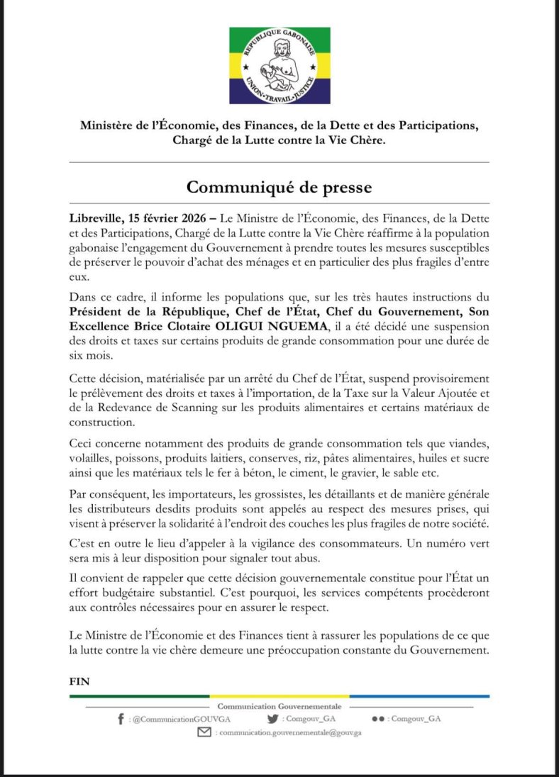 La décision du gouvernement gabonais de suspendre, pour six mois, les droits et taxes sur plusieurs produits de grande consommation s’inscrit dans un contexte de pression persistante sur le pouvoir d’achat des ménages.